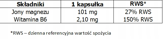 Składniki: Diglicynian magnezu, witamina B6 (chlorowodorek pirydoksyny), żelatyna, substancja utrzymująca wilgoć – glicerol, woda.